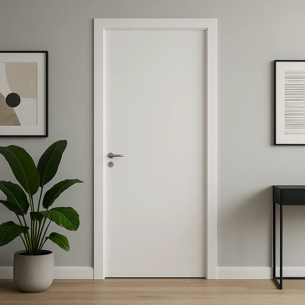 Puerta fabricada con hoja de MDF foleada en PVC color blanco. Su superficie es resistente y fácil de limpiar.